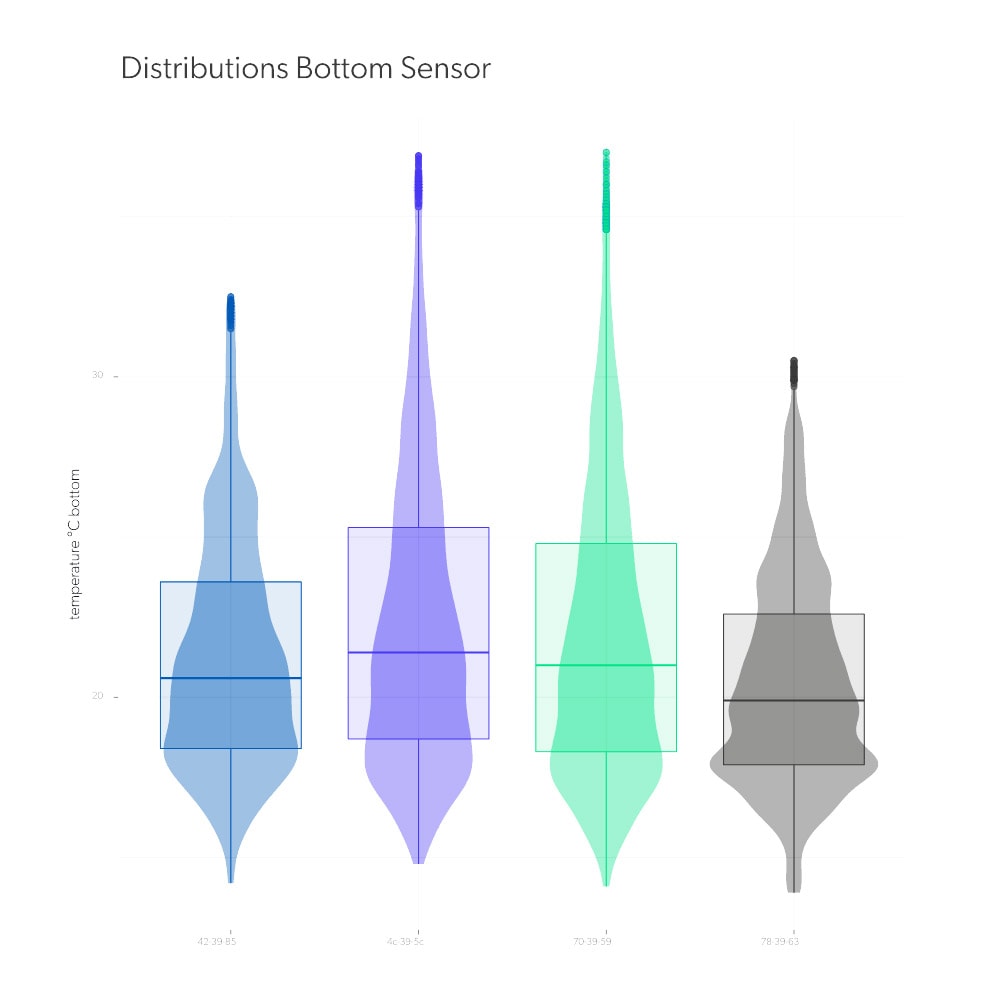 De distributies laten zien hoe vaak een bepaalde temperatuur voorkomt en hoe de temperatuurmeting per sensor unit verdeeld is, oftewel hoe waarschijnlijk het is dat een bepaalde waarde voorkomt. De grafiek visualiseert hoe vaak een bepaalde temperatuur per sensor unit gemeten is; hoe breder de viool, hoe waarschijnlijker het is dat een temperatuur gemeten wordt.